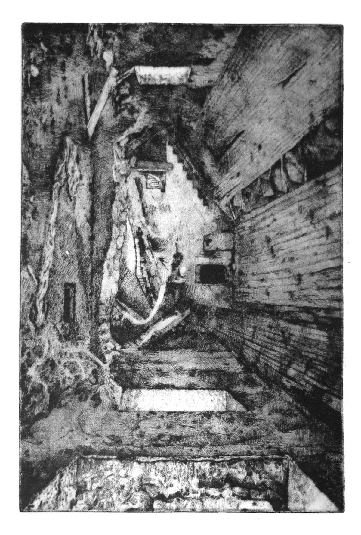 In this technique, image is incised into a polished metal (usually copper) plate with a sharp needle. Later, the plate is covered with an ink - but excess is wiped away with a cloth, so the ink stays only in traces of the needle. Then, under an etching press, the image is transferred to a piece of dampened paper.